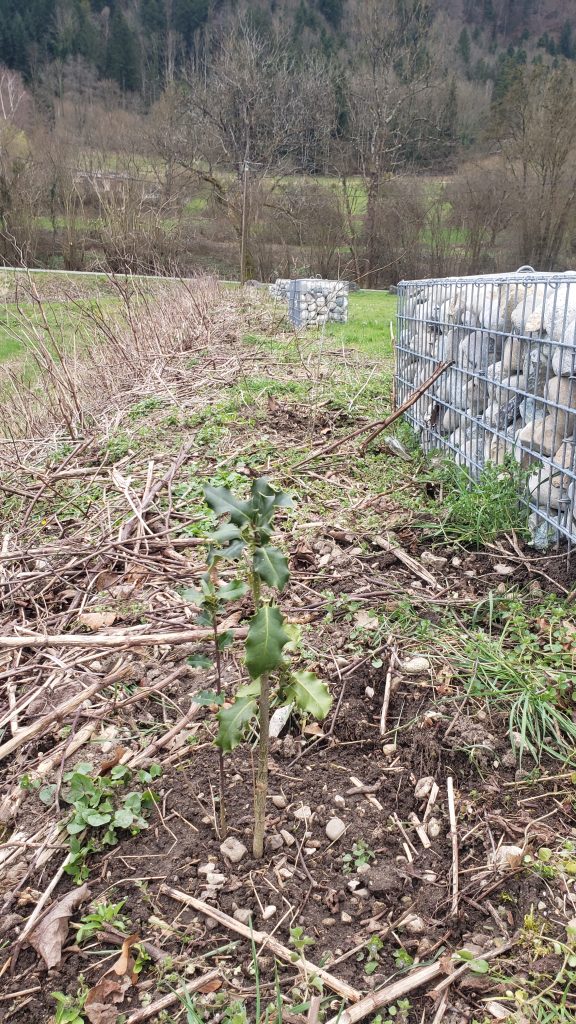 Ce secteur est envahi par des renouées et le but de cette plantation est de créer une haie défensive pour priver les invasives de lumière et donc de photosynthèse pour se développer.