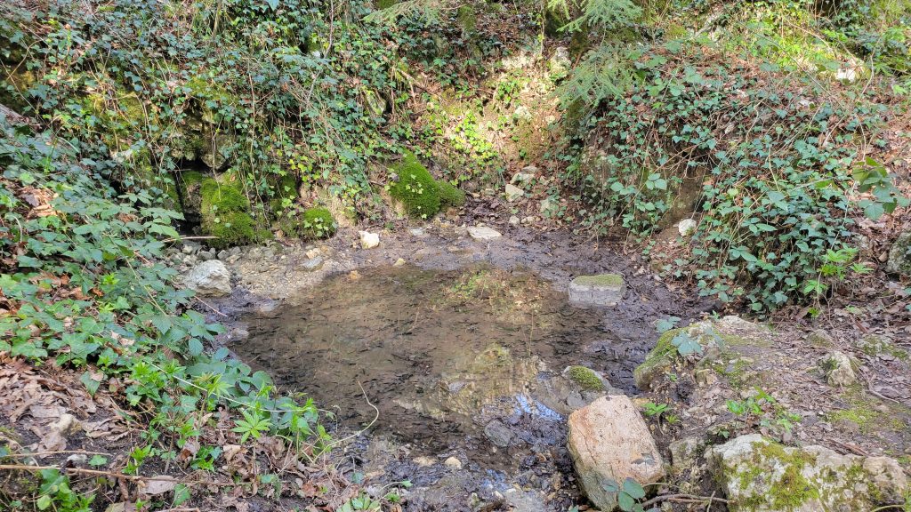 Le départ se fait côté nord, sur un sentier large qui mène répidement sur un petit belvédère que nous laissons pour continuer en sous bois vers une source conséquente qui présente des signes d’aménagement anciens voire antique.