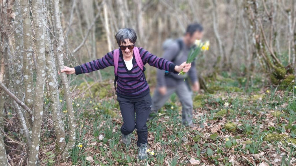 Plus loin, un tapis de jonquilles nous attend. Nous en cueillons quelques unes en veillant à rester en deça de la limite de prélèvement, ce qui est loin d’être le cas des autres promeneurs qui se livrent à une véritable prédation!